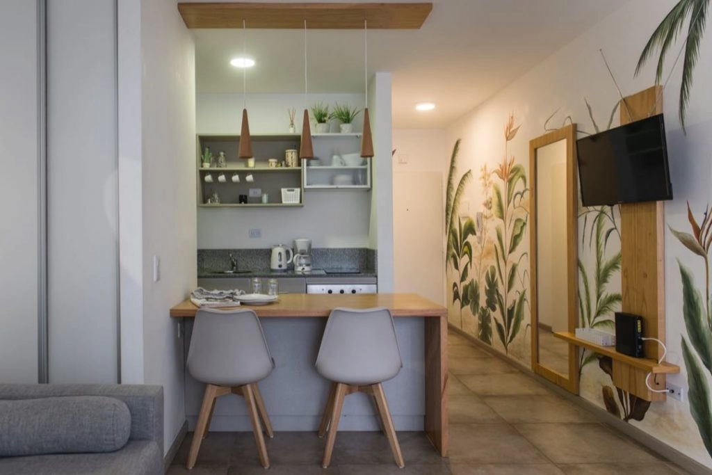 A falta de espacio, no está mal elegir un estilo, color o temática que tenga el rol protagónico: una sola, para que no maree. En este caso esa misión corre por cuenta del papel mural botánico pintado a mano por la artista Lidia Portillo (@lidia.m.portillo) que recorre un largo muro desde la entrada. A tono con este “bohemio moderno” se sumaron detalles en fibras naturales.