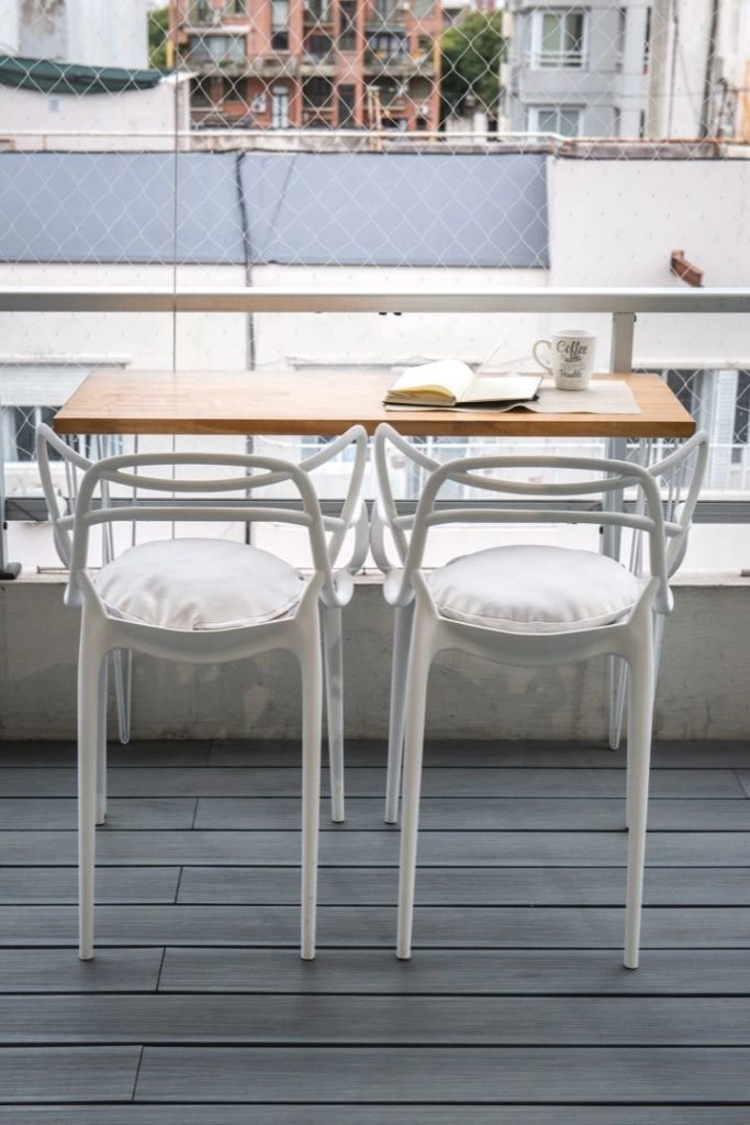 En el balcón se armó una original barra apta para hacer home office al aire libre, con una mesa armada con patas de acero pintado al horno en color blanco y tapa de madera, más dos sillas modelos Masters en color blanco (Mercado Libre).