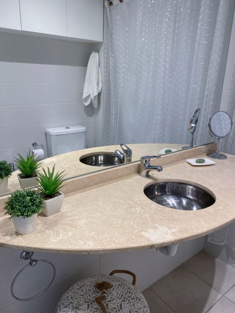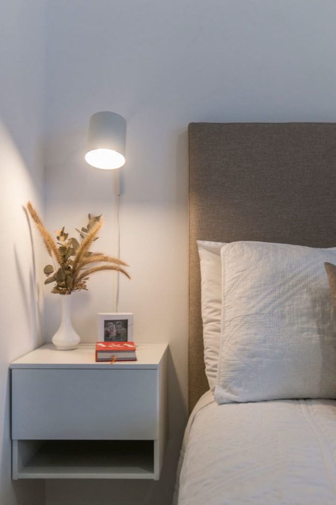 Los muebles y accesorios suspendidos son ideales para alivianar visualmente un espacio chico. Aquí se usaron mesas de luz suspendidas a cada lado de la cama. En el baño, una mesada curva facilita el acceso. Se aprovechó además el espacio sobre los sanitarios y entre el bidet y la pared lateral para ubicar muebles a medida en madera laqueada de blanco.