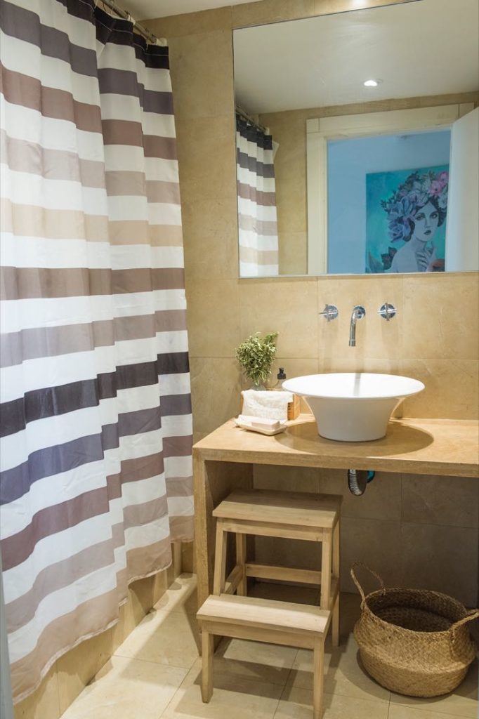 Una cortina a rayas horizontales en colores tierra marca la paleta dominante del baño principal. Entre los accesorios destacan la escalera (@manada_almacen), el organizador (@lucilah_deco), la jabonera (@el_blogdepato) y el disepenser (@cherryblossom.deco). En el pasillo de acceso, perchero doble de pie (@maca.home) dos cuadros de la artista Josefina Di Nucci y un banco en madera y hierro (@lucilah_deco).