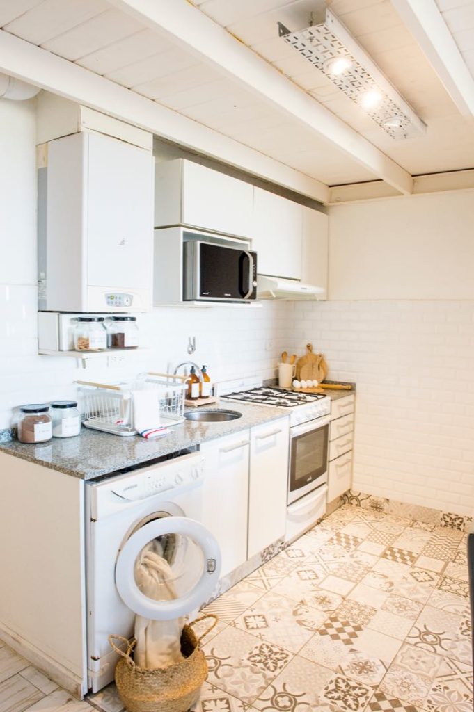 En la cocina, el piso propone un patchwork de mosaicos símil calcáreros (Cerámica Lourdes). Un tabique pintado de azul y con un gran espejo, oculta el bloque donde se ubica la heladera. Accesorios de cocina (cucharas, huevera, secaplastos, de @el_blogdepato) y frascos organizadores (cherryblossom.deco).