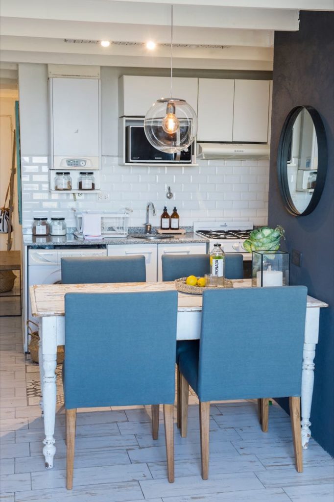Toda la planta baja tiene pisos modelo Retro, un porcellanato símil madera gastada (@alberdiceramica) que va perfecto con el estilo del depto. La cocina está integrada al pequeño living, pero sectorizada por el corte que propone la mesa de comedor en madera patinada con sillas en color azul (@maca.home) y