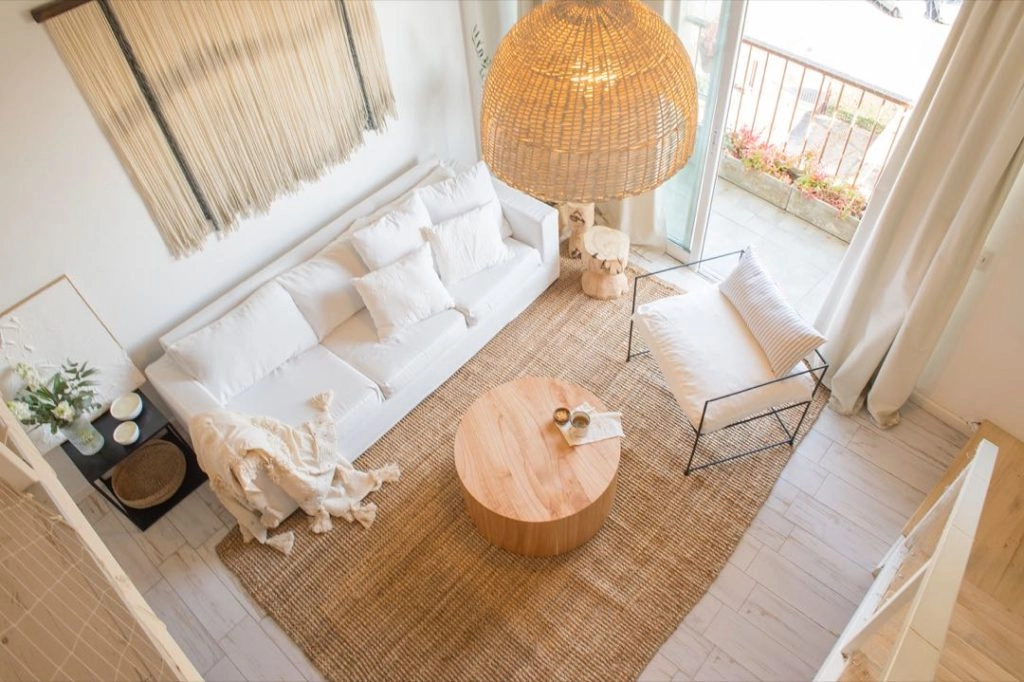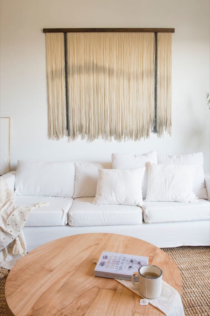 En el luminoso living, fibras naturales y tonos claros van de la mano. Lucila dispuso aquí un sofá con funda y almohadones de punta en blanco, una mesa redonda de madera maciza y un par de tochos como auxiliares, un sillón individual de hierro y una alfombra de yute (todo de su marca, @lucilah_deco). El ambiente se completa con un tapiz de la decoradora Clara Houssay (@hachezhome), muchas velas, una manta (@maca.home) y una lámpara de mimbre.