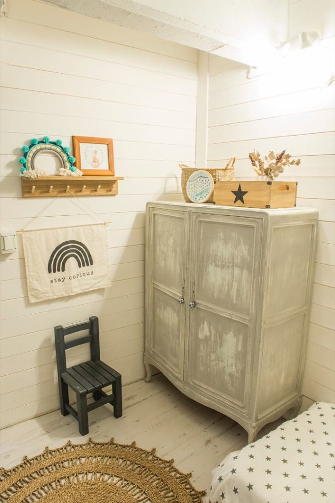 El cuarto del pequeño Pipe (un medio ambiente en el entrepiso) es pequeño pero súper alegre. La cama bajita lleva sábanas con estrellas (Estudio Pragmata) y remata en un cuadro con fotografía (Daufi Deco). No falta la regla para medir altura, el banderín en tela arcoiris (ambos de Nec estudio) y la alfombra de yute (Maca Home). Junto al mueble antiguo patinado que oficia de roperito, perchero de petiribí (Maca Home), contenedor con estrella (@kontainershop), adorno arcoiris y bastidor bordado (Casa Málaga).