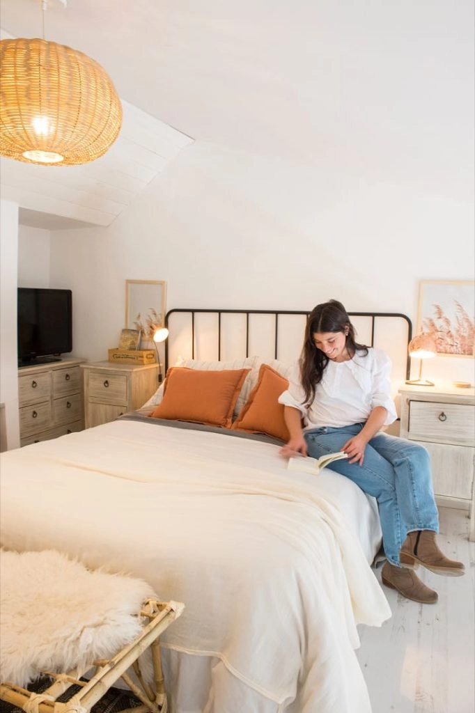 Lucila Houssay en su dormitorio principal, que balconea hacia el living. La cama con respaldo de hierro, edredón off white y almohadones en color naranja (todos de @lucilah_deco), remata en una banqueta de caña (@maca.home). Cuadritos con pampa grass (Bless Home) y lámpara con broche (Sol Palou Deco).