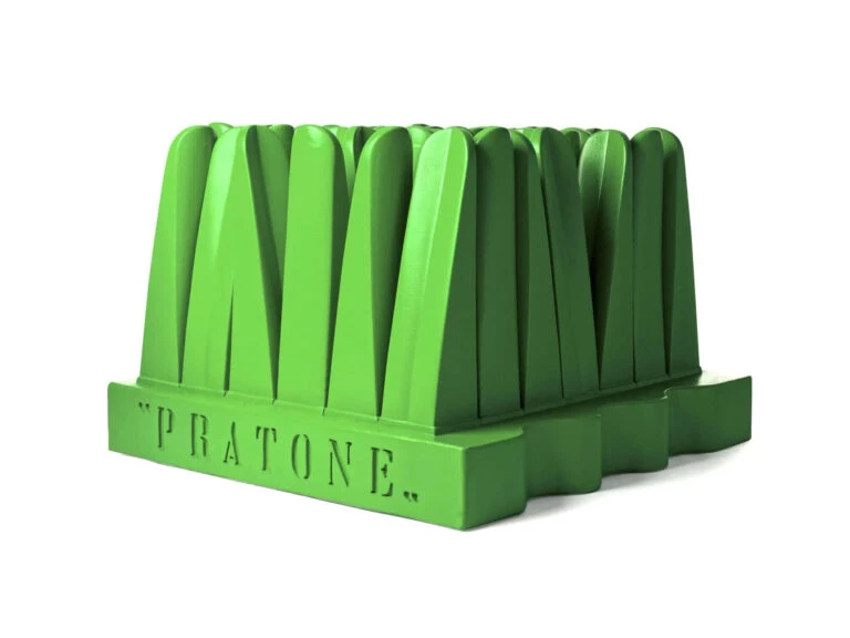Bajo la firma Gufram, el Pratone debutó en 1966, y de inmediato se ganó un lugar de privilegio en la historia del llamado “diseño radical” que modificó los patrones del diseño de la época y que presentó una inusual alianza entre la impronta natural (su apariencia y simulación de ser un bloque de hierba) y lo artificial (su materialidad y producción industrial).