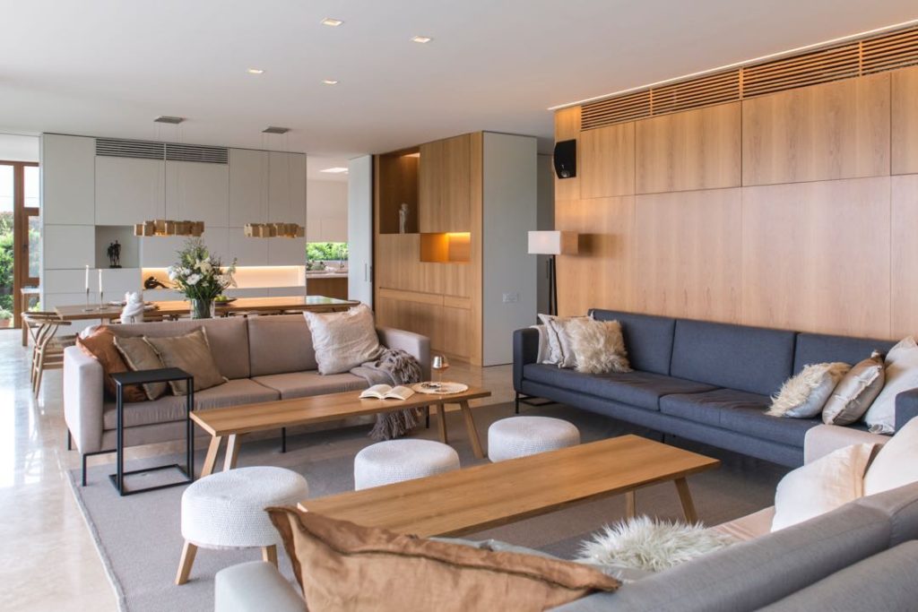 El living es decididamente cálido, con pisos de travertino turco (@novecento_company) y algunas paredes revestidas en placas laqueadas y de enchapado natural de goiabao tostado (@el caminostudio). En torno a dos mesas baja modelo Gervasoni en petiribí macizo (@elcaminostudio) se reúnen tres cómodos sillones tapizados en rafia natural de dos tonos, con almohadones (@compañía_nativa) y mantas (@elcaminostudio), y un simpático trío de pufs con funda de hilo color natural; todos sobre una alfombra de yute.