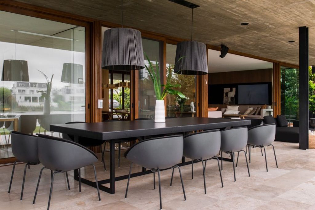 Una gran galería con cielorraso de hormigón visto y piso de travertino turco (el mismo de la pileta) alarga el uso de la planta baja, proponiendo un cómodo espacio semicubierto.