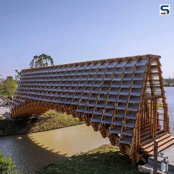 El estudio diseñó un puente peatonal en el corazón de esta zona calificada actualmente como complejo de ecoturismo. Se utilizaron cientos de elementos de madera, con especial atención a las técnicas tradicionales y rurales de construcción empleadas en la zona, en donde la madera es abundante y protagonista.
