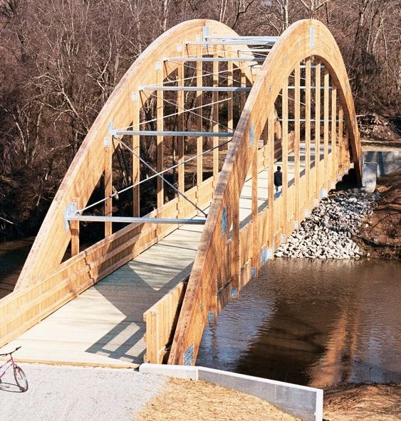 El legado del puente original se conserva mientras refleja los bosques de la región; el puente de reemplazo incorpora pilares ferroviarios de hormigón existentes y componentes de madera recién fabricados en su diseño. Se prefabricaron dos paneles de cubierta de puente fuera del sitio y se transportaron al sitio para el ensamblaje final. El puente se montó en el sitio en una mañana. Las cubiertas del puente cuentan con arcos de madera laminada encolada (glulam) y cubiertas de madera. Las varillas de acero conectan los paneles de la plataforma a los arcos de glulam. La cubierta del puente está formada por una cubierta ondulada de acero y correas de madera maciza aserrada. El puente de madera a la vista es un complemento natural del entorno exterior que lo rodea.