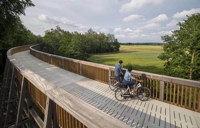 En la provincia belga de Limburgo se emplaza una red de ciclismo turístico que se denomina “Cycling Through the Heathland”. Este espectacular puente está formado por columnas y vigas de madera entrelazadas, al igual que sus muros, en los que se utilizó madera de pino local. Fue realizado por los estudios de arquitectura Maat-Ontwerpers y Bart Lens, quienes pensaron en este carril para bicicletas – ubicado en el Parque Nacional Hoge Kempen – para la organización turística Visit Limburg. Tiene cuatro kilómetros de largo e incluye un puente de madera de 300 metros de largo, que ofrece vistas panorámicas de los brezales y bosques de pinos circundantes.
