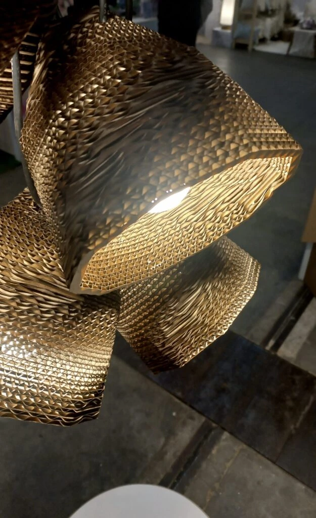 Encartonarte es otro punto sobresaliente de la feria. Su stand se destaca por la liviandad y el gran impacto visual a partir del cartón. Y no hay mejor escenografía para ver las luminarias del arquitecto Gustavo Boffi. Su misión: “lograr la alquimia del cartón corrugado, de lo simple y ordinario, a lo complejo y exquisito”.