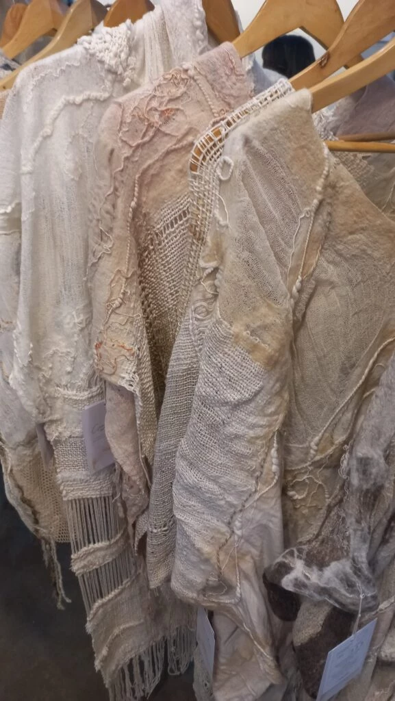 Geografía del Encuentro delimita “el territorio demarcado en las prendas” mediante un fabuloso mix de telar y fieltro, con tintes naturales que celebran la fusión del pasado y lo ancestral con el el arte contemporáneo.