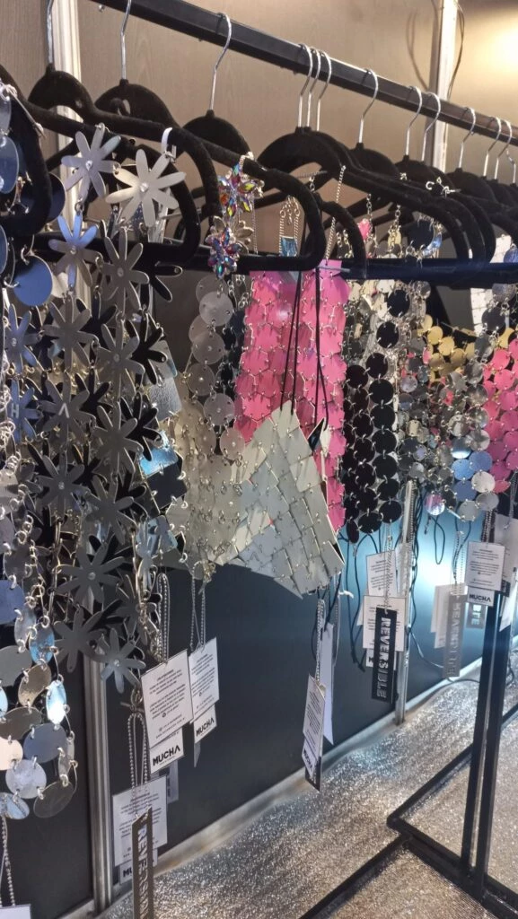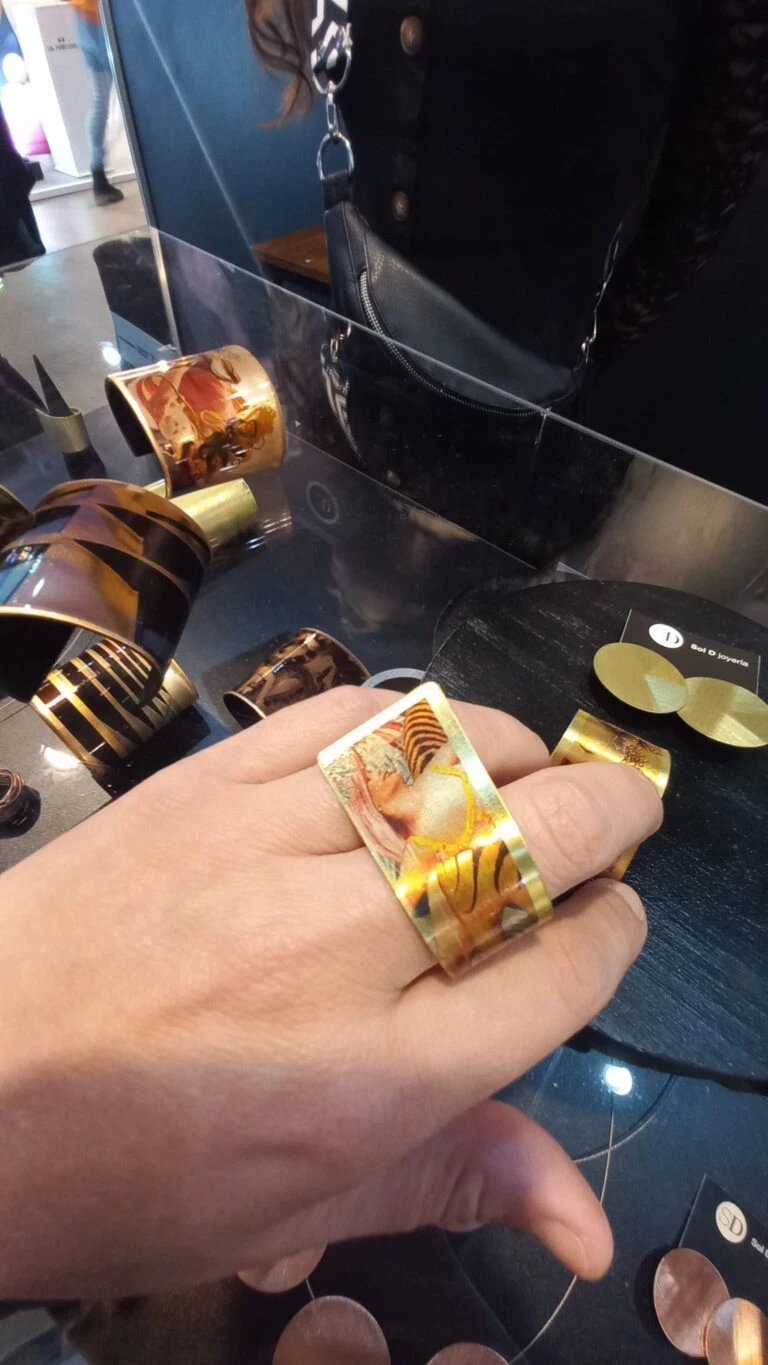 Sol D Joyería reluce en su espacio de accesorios a través de una línea con impresión de obras artísticas y registros urbanos sobre metales. “Utilizo técnicas tradicionales y no tradicionales, como también diferentes materiales, como el acrílico, resina y caucho”, describe Sole Rodríguez, además diseñadora gráfica egresada de la UBA. Y las piedras colgantes ¡de cartón! de Patricia Mogni son otro hallazgo de la feria.