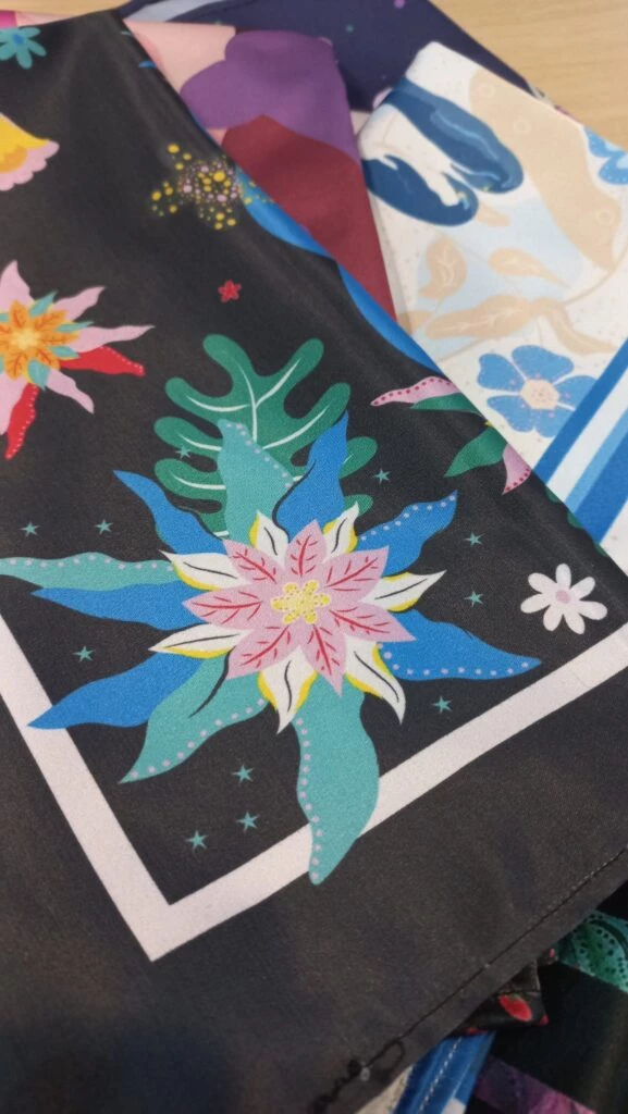 Oh Margo nos detiene del paseo por la feria con sus ilustraciones de tonos vibrantes, para quedarse a probar los mil y un pañuelos estampados. Y en Atelier Delcroix la invitación es a “vestir es el arte de comunicar a través de la indumentaria”. Un must de Estilo en la feria.