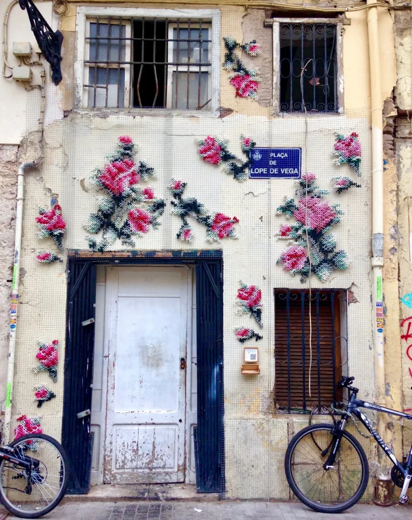 Además de ser licenciada en Bellas Artes y una apasionada del diseño y la artesanía, la valenciana Raquel Rodrigo (@arquicosturastudio) le da una vuelta una vuelta de tuerca al concepto de arte urbano y llena las calles de punto de cruz a gran escala.