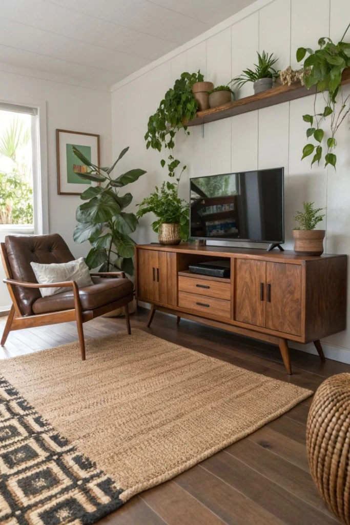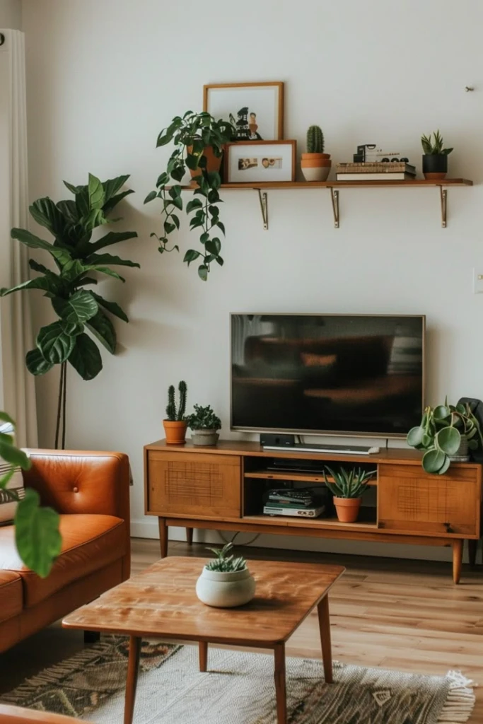 El rack también puede ser el centro de atención del living, así que no lo dejes pelado. Sumale plantas chicas como potus, velas, libros, una lámpara canchera o alguna obra de arte. Y si te gusta lo simétrico, jugá con objetos en los extremos para equilibrar.