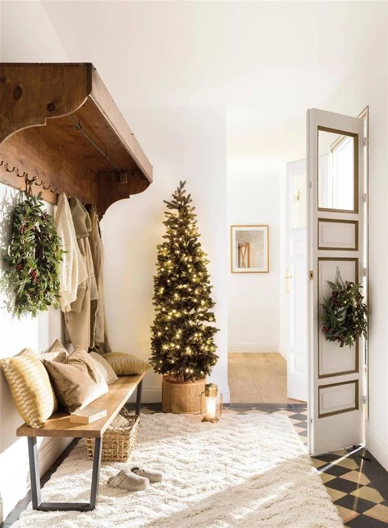 Si es muy pequeño, puede ir sobre el mueble recibidor y no hace falta que esté repleto de adornos, con sumarle algunas guirnaldas de luces cálidas es más que suficiente para llevar el espíritu navideño a este ambiente clave.