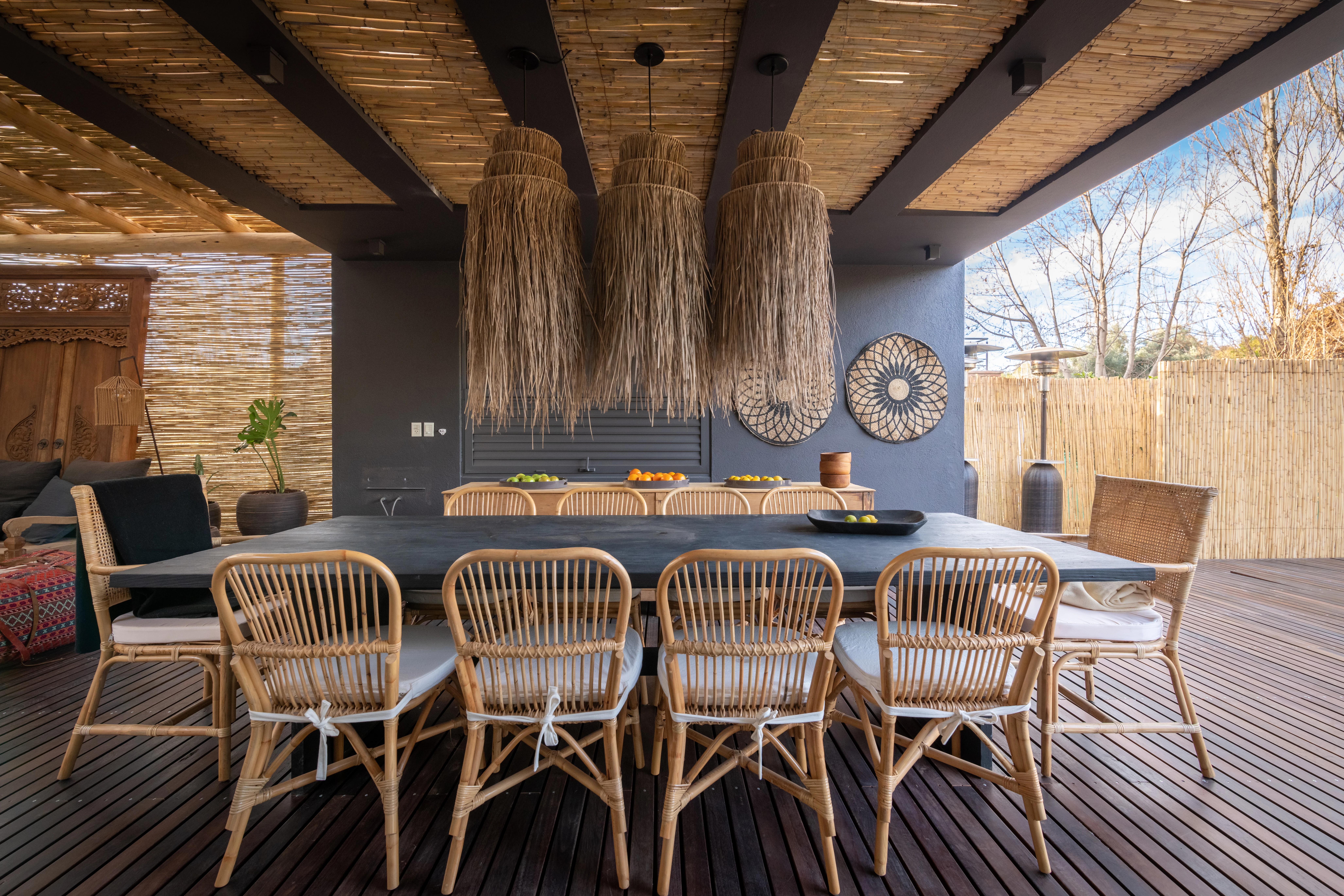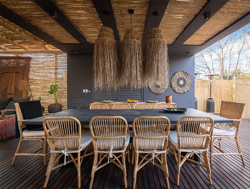 El deck se extiende para darle contención a un comedor de exteriores que también parece sacado de una escena playera. Tres simpáticas lámparas de bras de Bali caen sobre la mesa de madera hecha de maderas nativa.