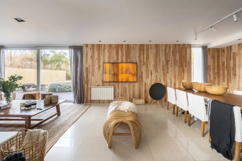 La caja del área social se trabajó con un mix de revestimientos: madera maciza aserrada en algunos casos, látex gris oscuro en otros; ambos acompañados por pisos de porcellanatos. El banco gusano indonés se ubica de manera transversal para marcar una separación entre el living y el comedor.