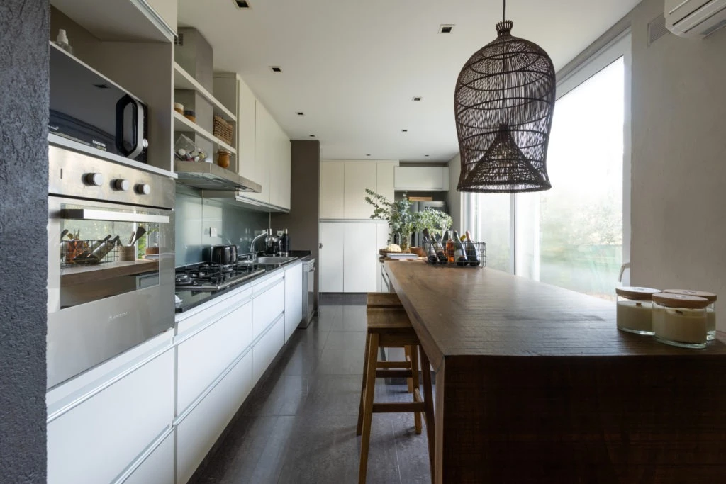 La cocina es de líneas modernas, con amoblamientos en termoformado blanco y electrodomésticos con frentes de acero. Como contraste de estilo y de color, una gran barra de madera maciza con terminación rústica que oficia como isla, mesón de trabajo y desayunador, acompañada por un par de taburetes clásicos.