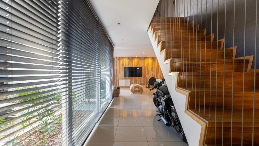 La iluminación general de este espacio (@lightiluminación) se completa con una gran lámpara de rattán que acentúa la altura del ambiente. La escalera que lleva a los dormitorios de la planta alta tiene como protección unas finas varillas de hierro de obra puestas de manera vertical.