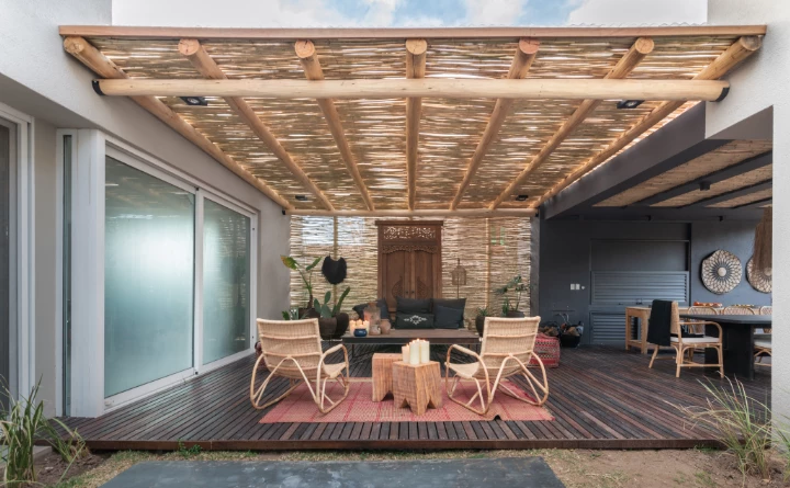 Una gran pérgola con postes de eucaliptus y cañas corona este original living de exteriores, aportando un aspecto relajado: la fuerza y peso del deck de madera se contrarresta con la liviandad de la pérgola.
