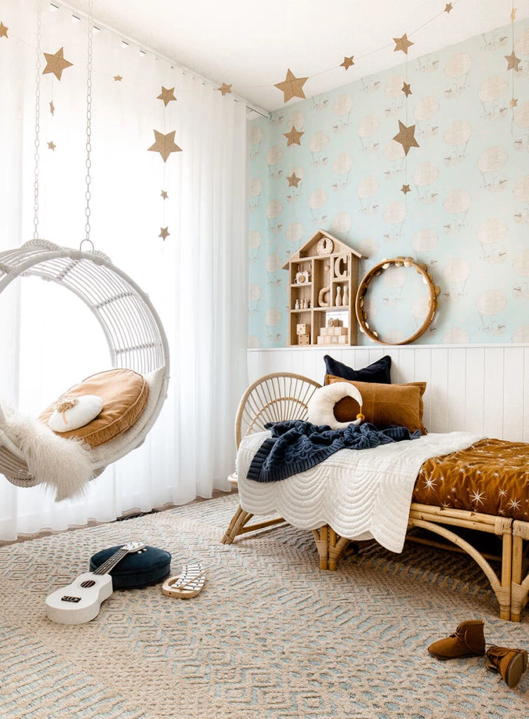 La cama es de bambú y junto a ella se encuentra una pequeña mesa de luz de terrazo, el revestimiento estrella de la temporada. Dos lámparas de fibras naturales cuelgan sobre la cama y se encienden con una luz cálida y tenue al momento de leer el cuento de las buenas noches.