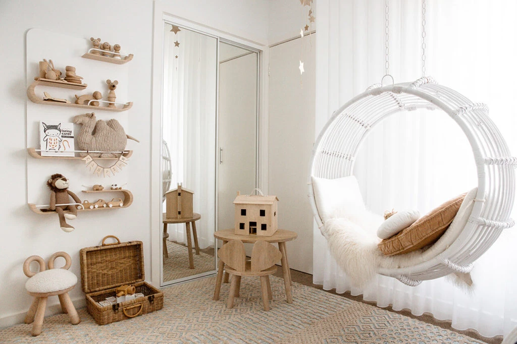 Se decidió apostar por muebles, juguetes y accesorios decorativos de madera y fibras naturales para ganar calidez y crear una atmósfera armoniosa.