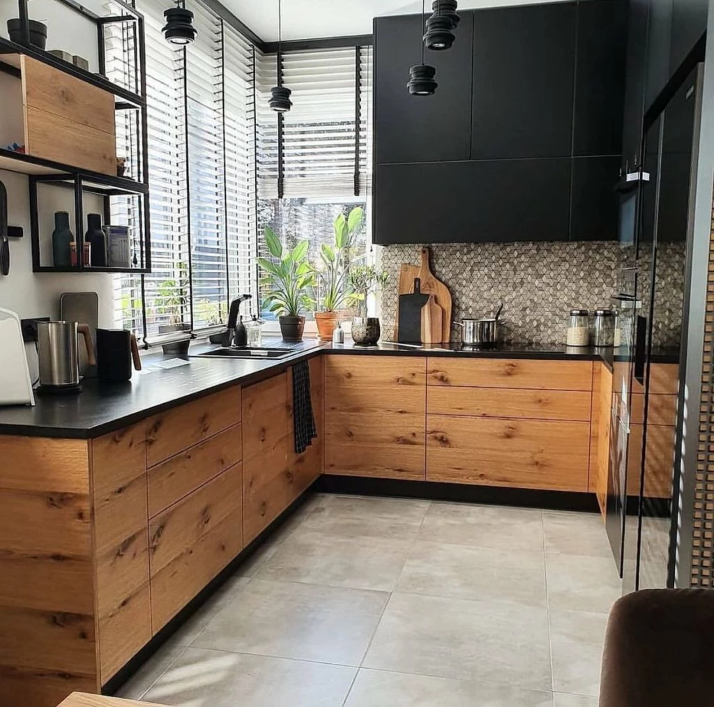 Siguiendo con el recorrido, nos encontramos con una cocina súper moderna, funcional y con toques industriales. Los detalles en madera y negro vuelven a hacerse presentes en este sector de la casa. Junto a una de las ventanas, se decidió colocar una barra desayunadora para ganar un espacio extra para las comidas más informales.
