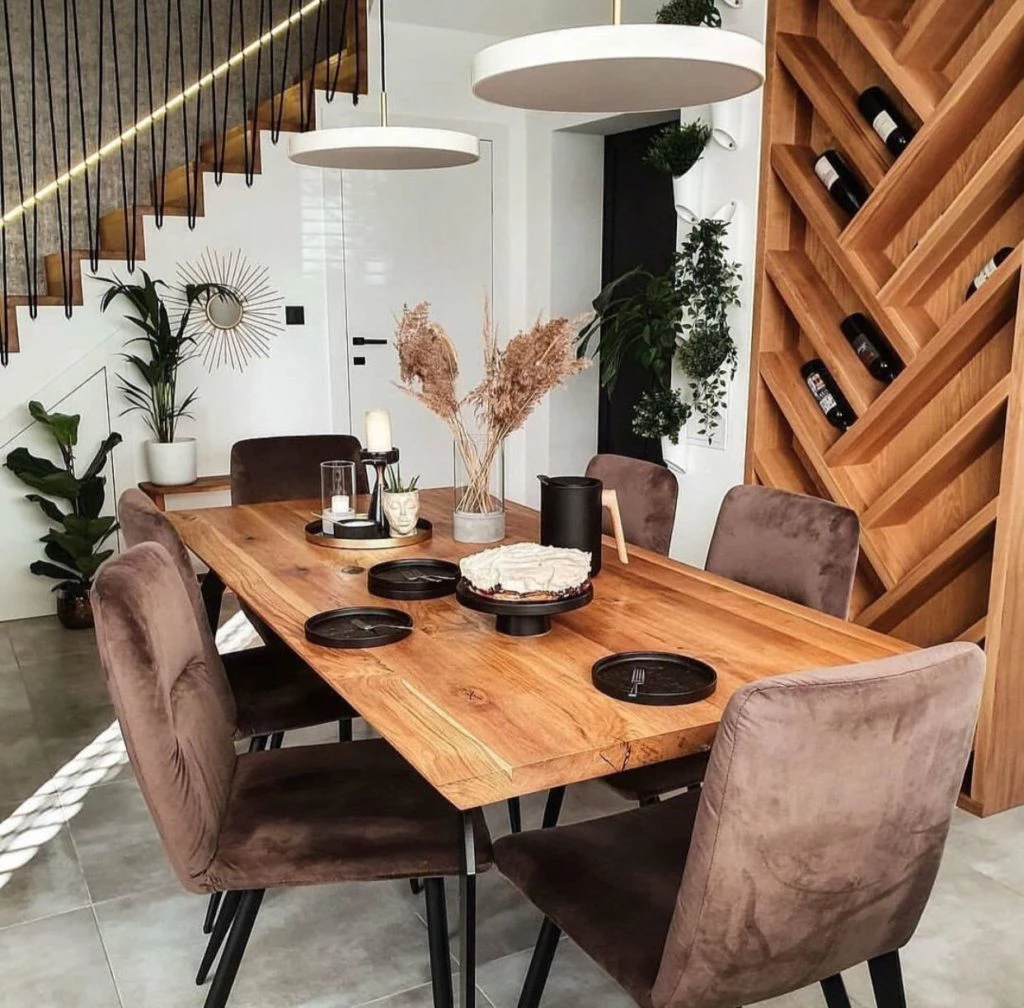 Junto a la entrada se encuentra el comedor principal, el cual se caracteriza por tener a la madera como protagonista y ser muy sofisticado. Seis sillas tapizadas en terciopelo color marrón claro aportan un plus de delicadeza, al igual que los múltiples detalles deco como las plantas y un súper mueble que funciona como bodega/vinoteca. Dos lámparas de diseño redondas sobrevuelan sobre este sector aportando un toque moderno y elegante.