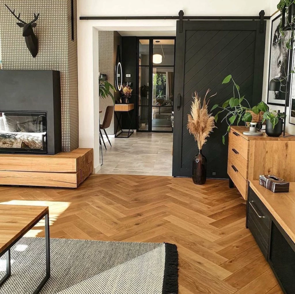 Finalizando con el recorrido nos encontramos con la sala de estar principal, la cuál sigue una línea estética similar a la del recibidor. Los pisos son de madera clara al igual que parte del mobiliario, lo que aporta un plus de calidez. Una chimenea moderna conquista este sector siendo perfecta para subir la temperatura en los días más fríos. Otro detalle deco que marca tendencia y se lleva todas las miradas, es la puerta granero en color negro que separa a este sector del resto de la casa.