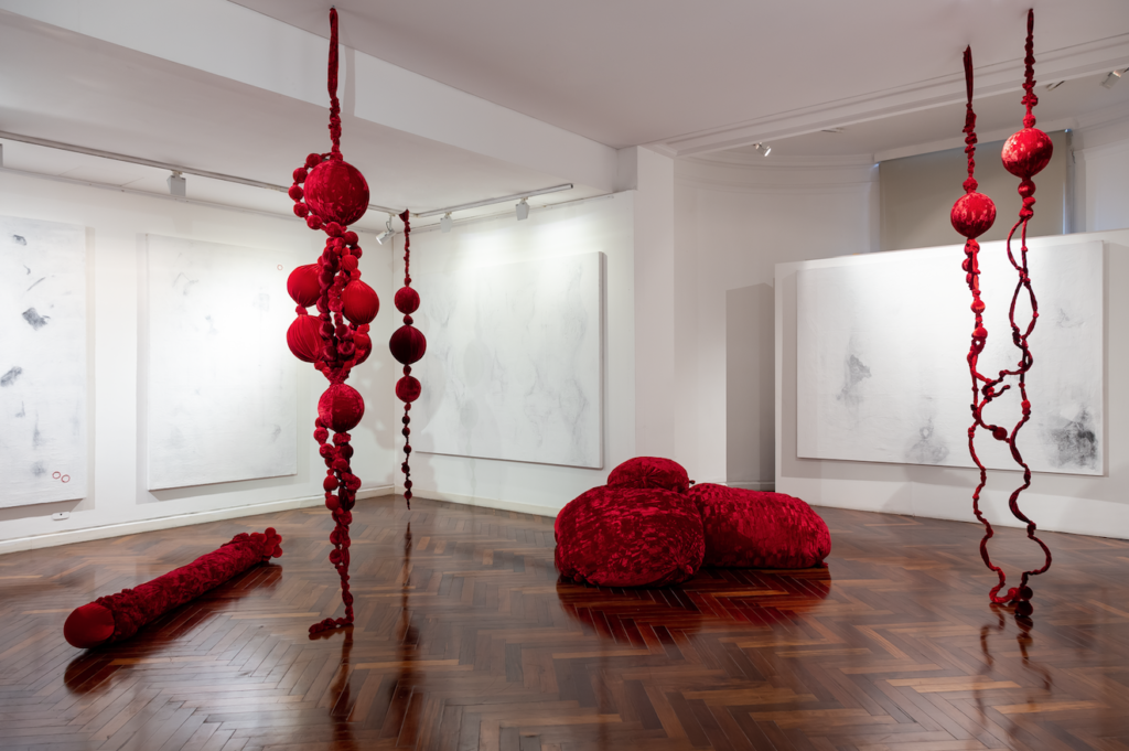 Trabaje en pinturas blancas y acuarelas de color repletas de detalles. Algunas obras median 5 mts y otras 7 mts. Los dibujos blancos y negros representaban mis familiares, y las esculturas blandas de terciopelo me representaban a mi y a las mujeres de la familia. Empecé a trabajar en 2020 y terminé en 2021.