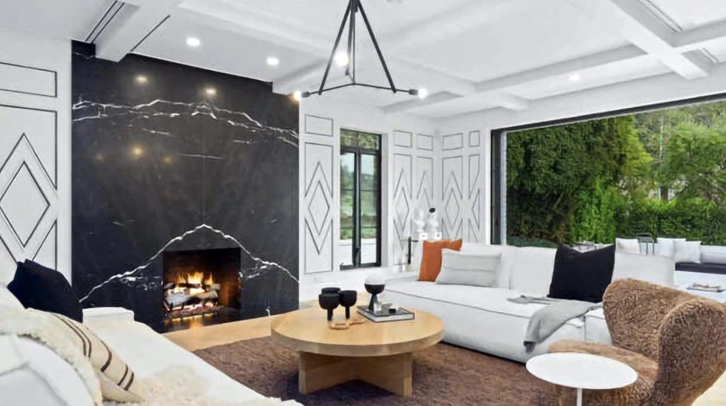 Junto a la entrada principal, un pasillo conduce a una lujosa sala de estar que se caracteriza por ser súper cálida pero muy moderna y elegante. Los pisos también son de roble blanco francés y cuenta con una chimenea empotrada en una pared de mármol negro. Los detalles decorativos son claves en este amplio y luminoso ambiente.