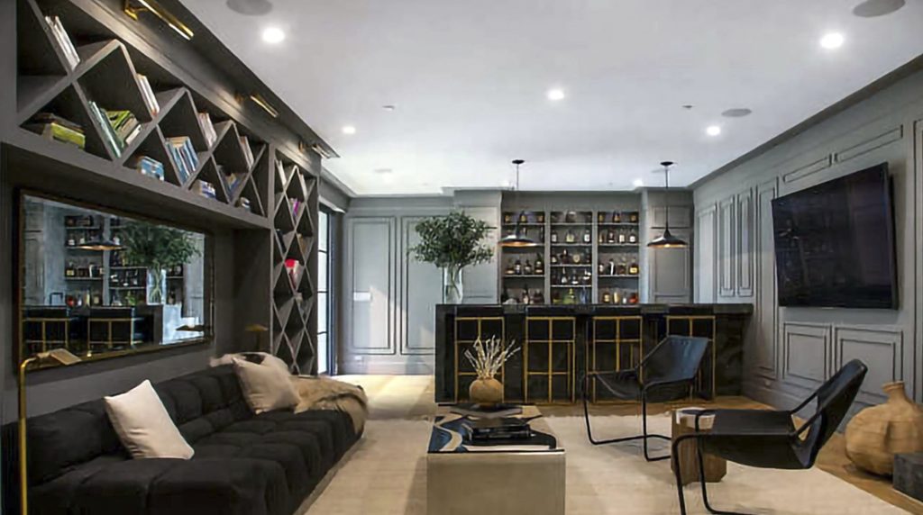 Una sala de estar muy elegante con el gris oscuro como protagonista, conquista la planta alta. Cuenta con una enorme biblioteca empotrada en la pared principal y con un mini bar con bebidas de primera línea y una barra de mármol negro con cuatro banquetas.
