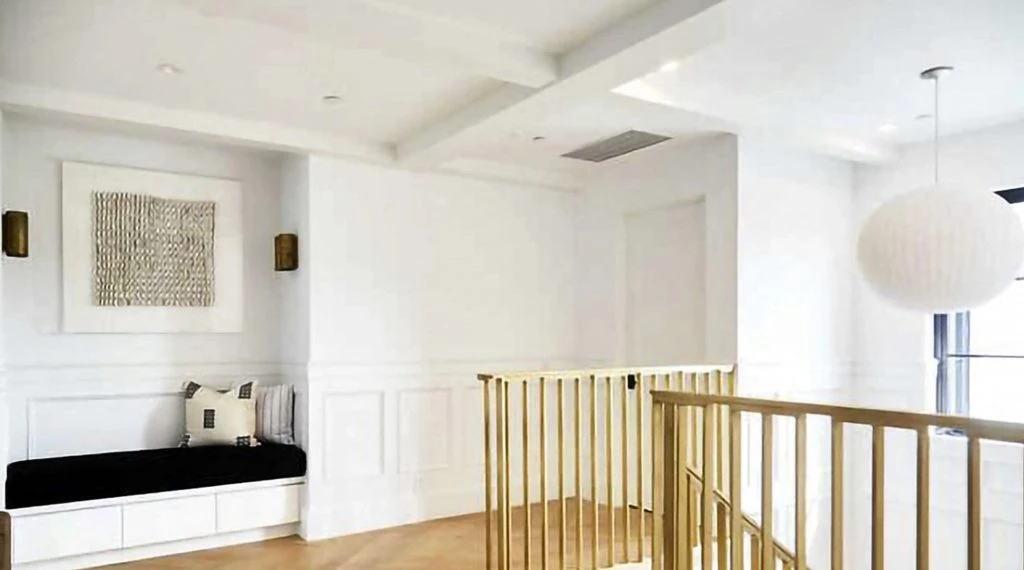 Una escalera moderna con barandas doradas, conduce a la planta alta en la cual se encuentran los dormitorios, algunos baños, una sala con un mini bar y hasta un gimnasio completamente equipado.
