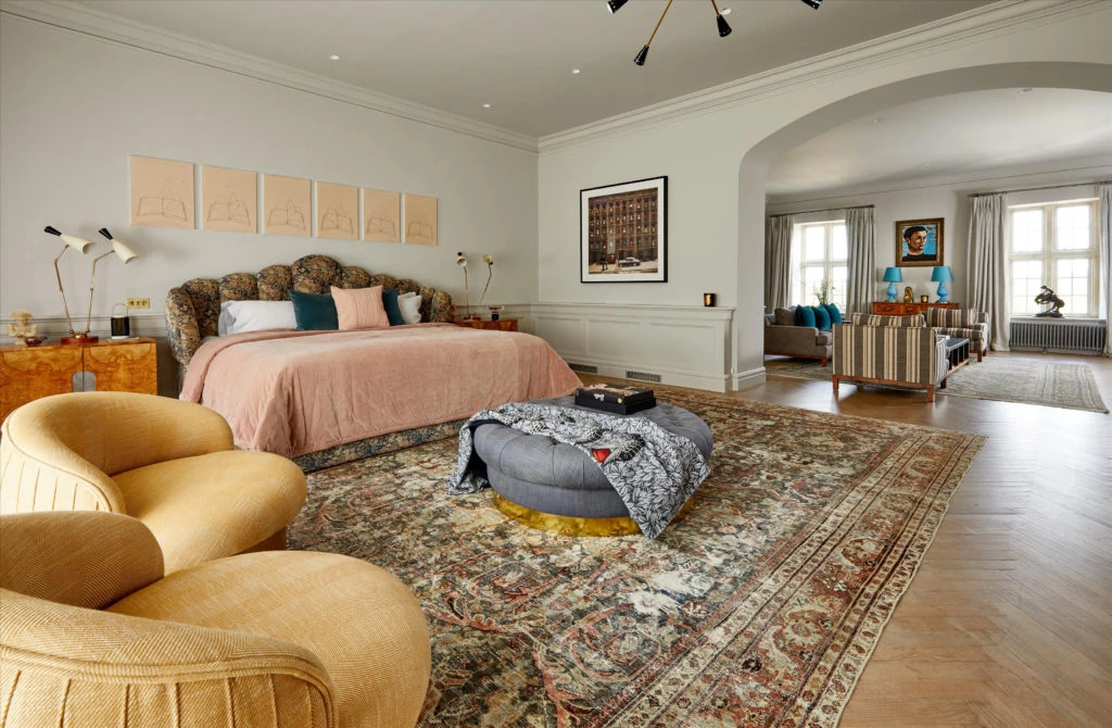 El dormitorio en suite es súper amplio y luminoso, y cuenta con detalles arquitectónicos de la época. Los pisos son de madera clara y la decoración tiene aires clásicos modernos. Además de contar con dos baños completos y tres vestidores, tiene un living con varios sillones y una chimenea de piedra.