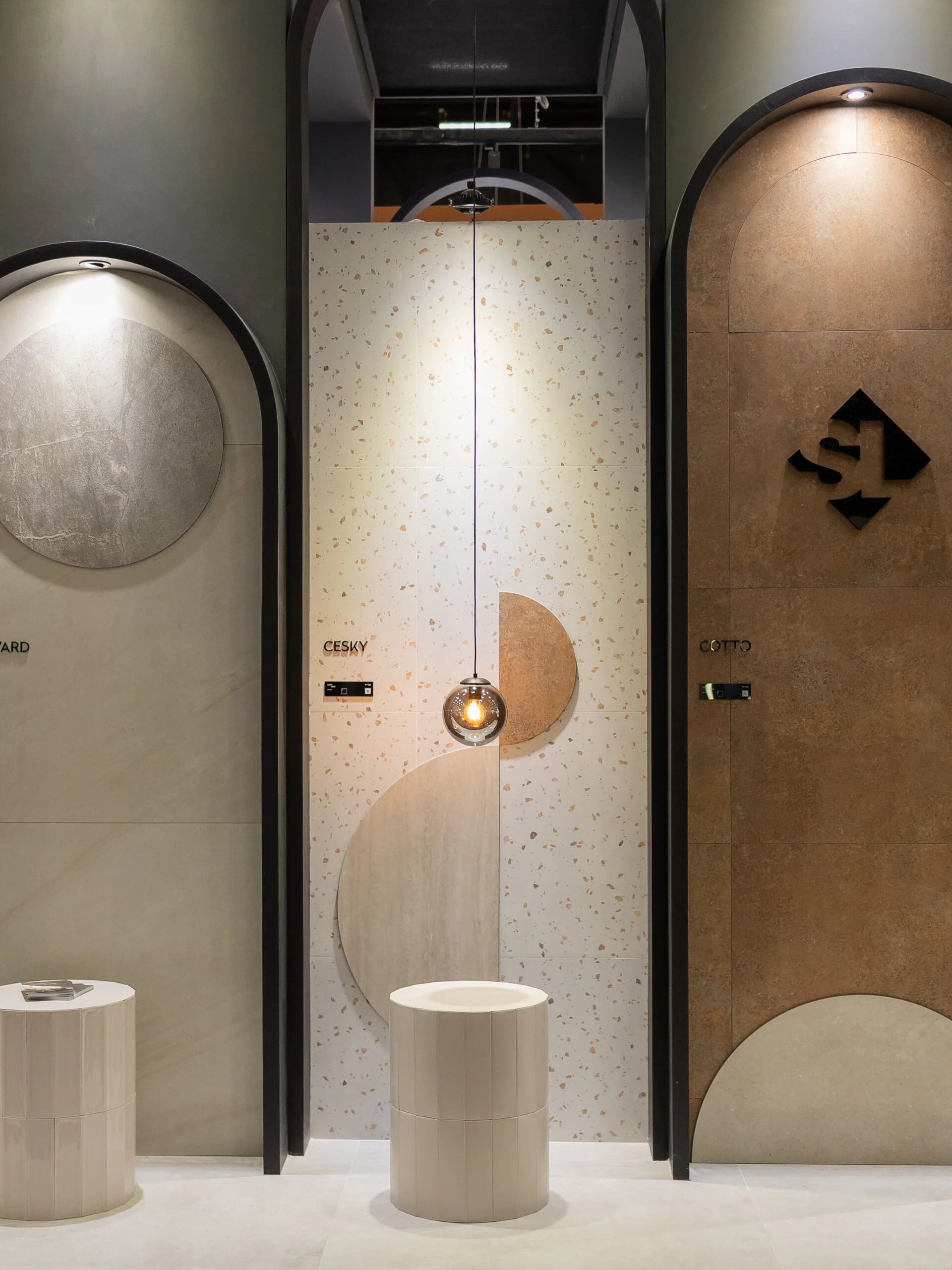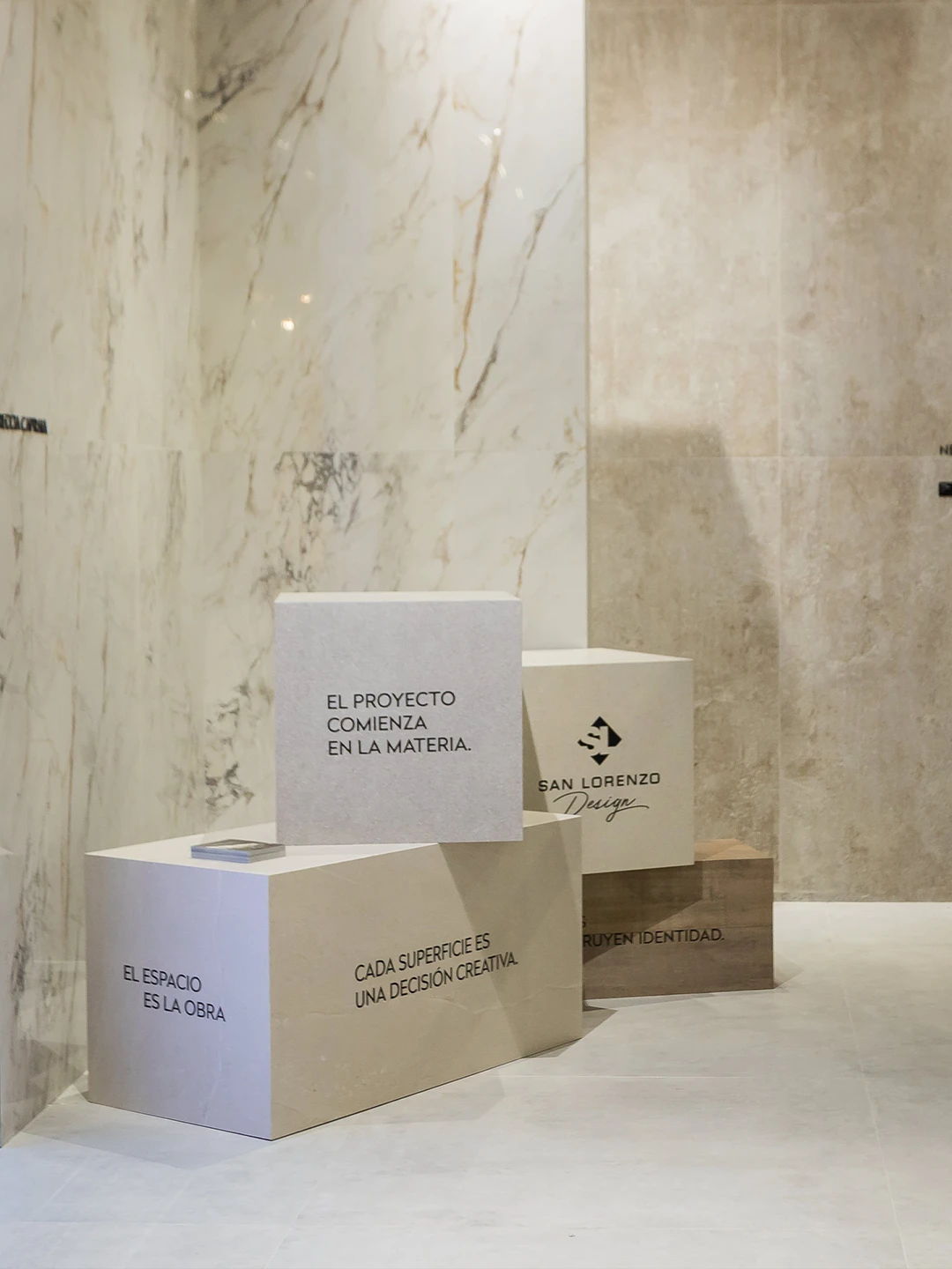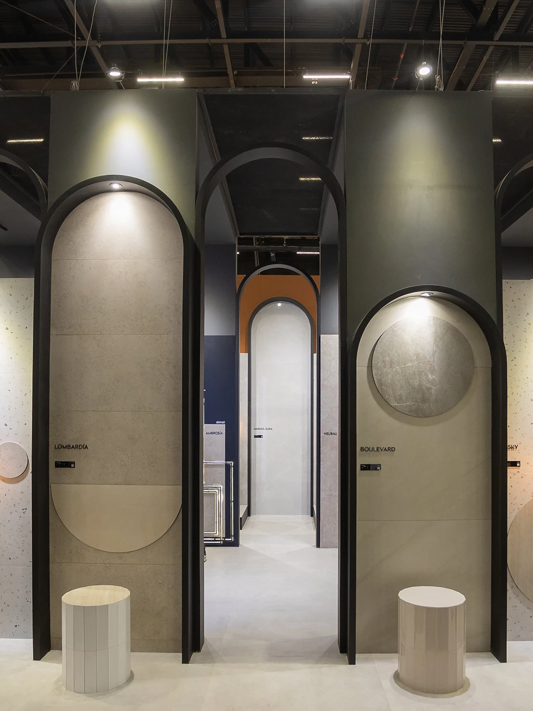 El espacio, concebido como una galería contemporánea, propone un recorrido curado donde la materialidad es protagonista. A través de una sucesión de arcos que aportan ritmo y profundidad, el visitante es guiado por distintas escenas en las que cada superficie se exhibe como una obra. La propuesta invita a detenerse, observar y, sobre todo, interactuar. Todo los materiales expuestos no solo se pueden observar, se pueden tocar, haciendo una experiencia sensorial que conecta con la emoción y la memoria.