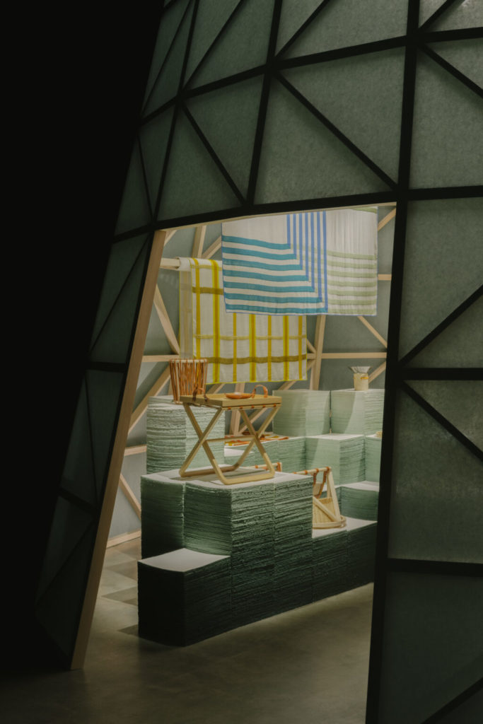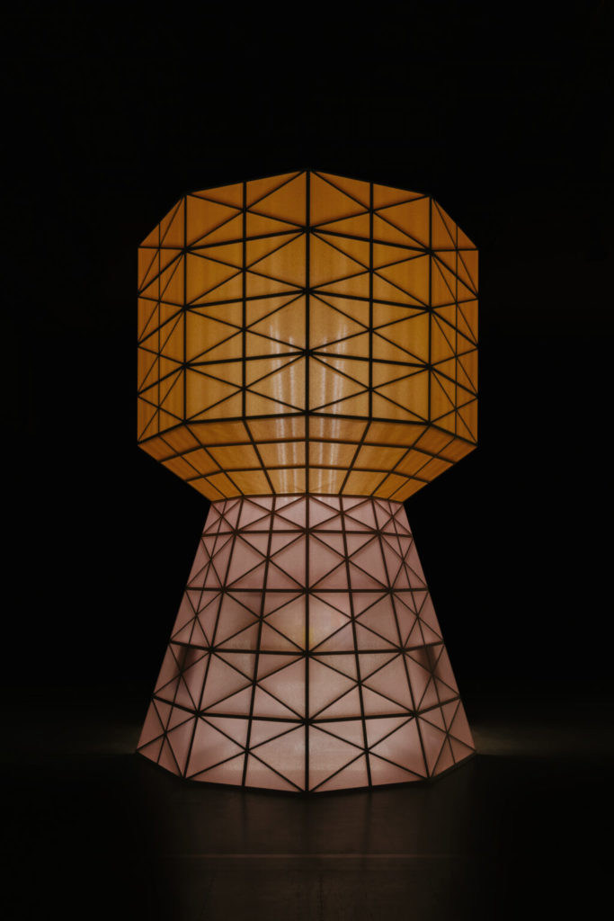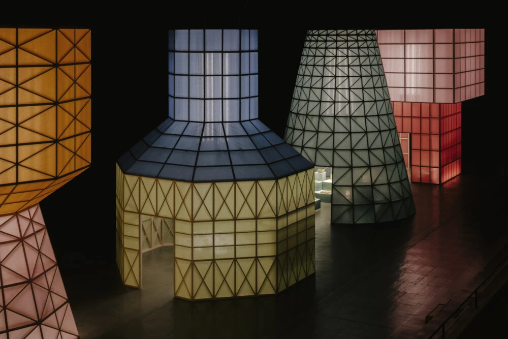 Estas instalaciones, con forma de torres de agua, hechas de madera y recubiertas de papeles de colores translúcidos, parecen ligeras e irradian luz. En el interior, cada objeto expresa un savoir-faire cuya fuerza se basa en la precisión.