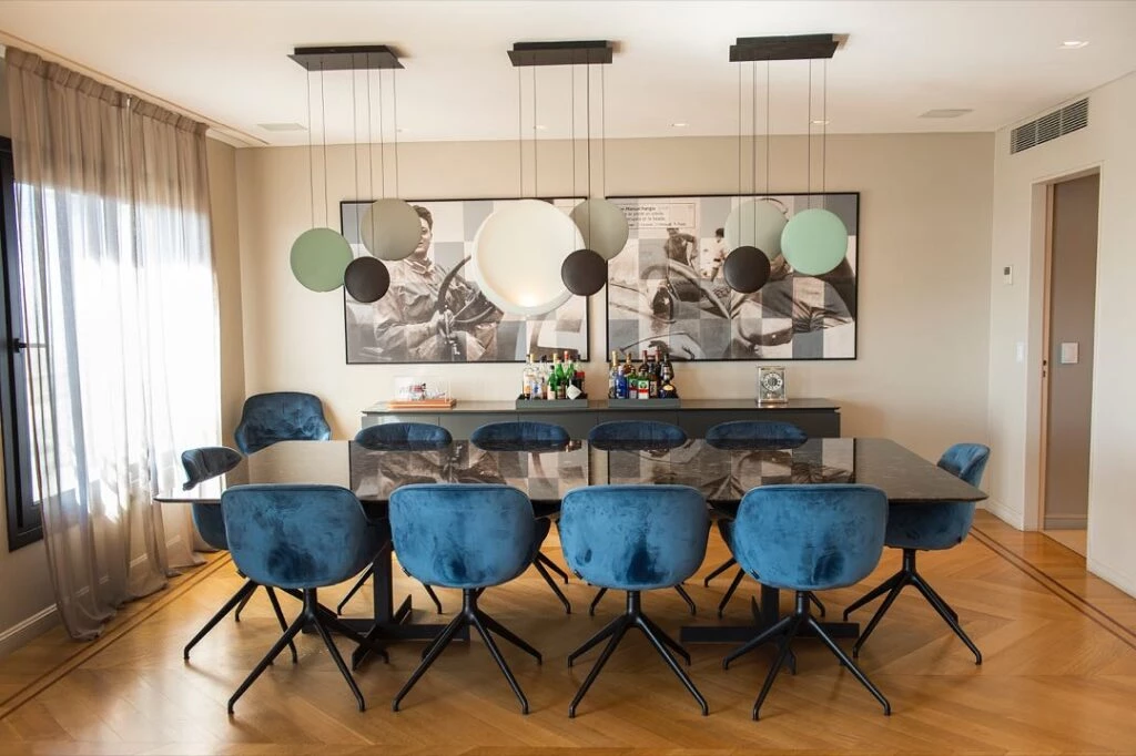 Si te gusta la vanguardia en diseño, seguro vas a detenerte en este comedor que propuso la arq. Soledad Llanos. La mesa con base de hierro negro y tapa de cuarcita Lemurian Blue (@marmolesragolia) suma la exquisita compañía de unas sillas Lego (@walmerargentina). Tienen base giratoria y cuerpo tapizado en un azul eléctrico que resalta sobre los pisos de Eslavonia, totalmente restaurados.