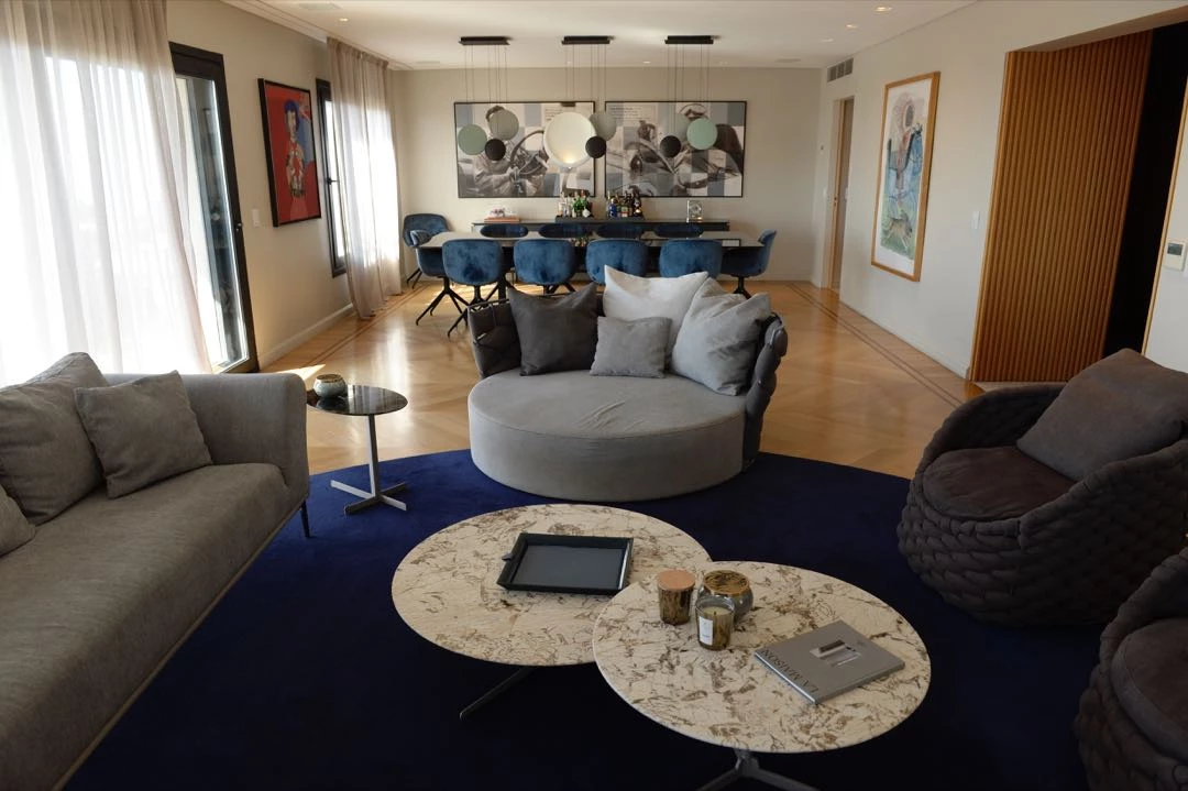 En el living, la paleta base es mayoritariamente gris, en sus distintas gamas, acompañada por el azul eléctrico de la alfombra (también circular) y por las pinceladas de colores que suman las obras de arte, de gran presencia en este depto.