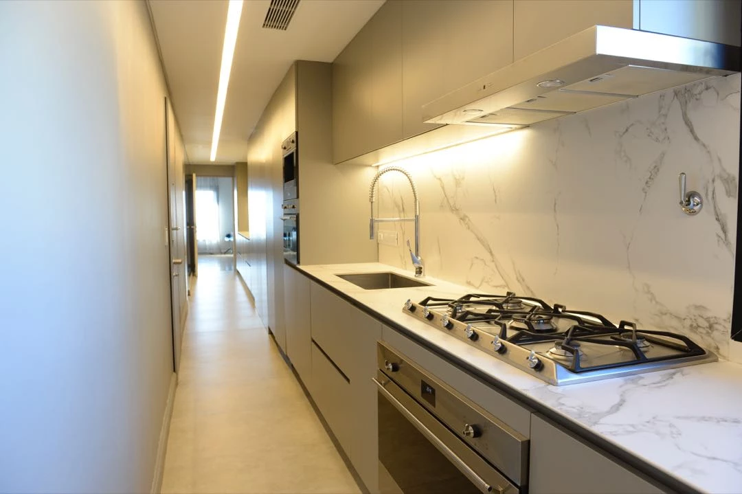 La cocina fue reciclada a nuevo para volverla más moderna, sumarle funcionalidad y unificarla en un blanco níveo. De formato pasillo, tiene una larga mesada con alzada resuelta en Dekton Aura, grifería (Hansgrohe), electrodomésticos (Smeg) e iluminación embutida (Concepto y Luz). Sobre la mesa alta de comedor de diario, dos colgantes con cuerpo de metal perforado (Iluminación Agüero). Banquetas (Walmer).