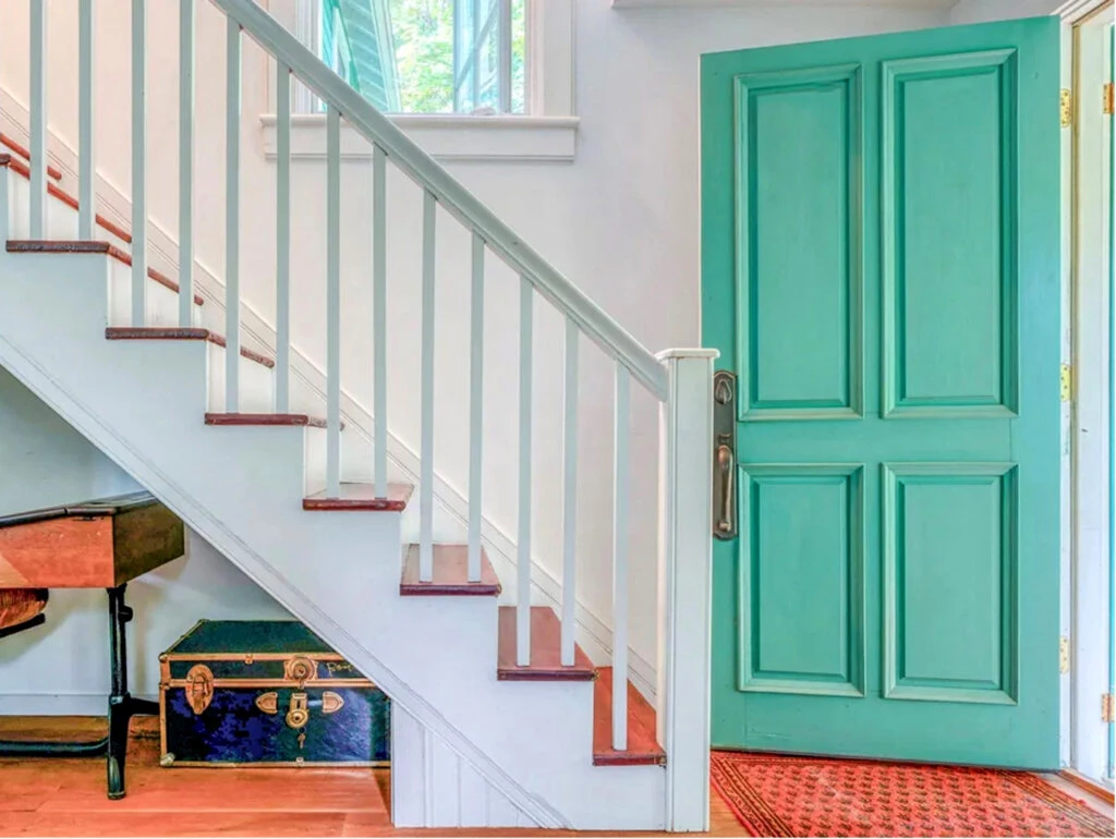 Una puerta pintada de color verde agua da una cálida bienvenida y adelanta el estilo que predominará en el resto de los ambientes. Debajo de la escalera, que está justo en la entrada, se pueden apreciar diferentes objetos antiguos que decoran e imprimen una personalidad.
