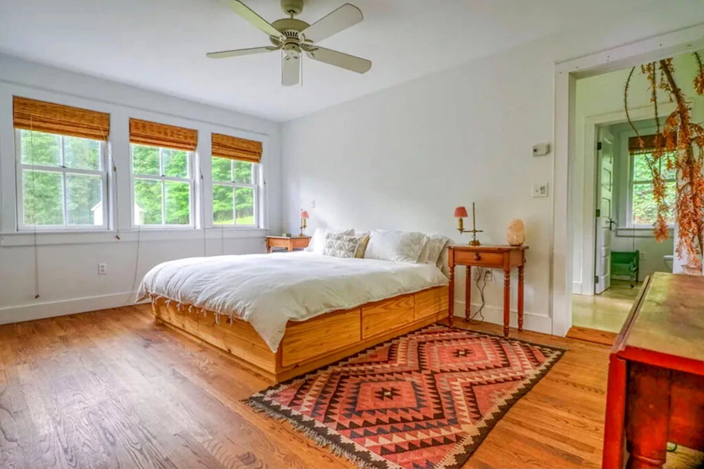 El dormitorio principal es súper simple y acogedor.Tiene una cama matrimonial de madera con espacio de guardado, dos mesas de luz vintage y una alfombra kilim divina.