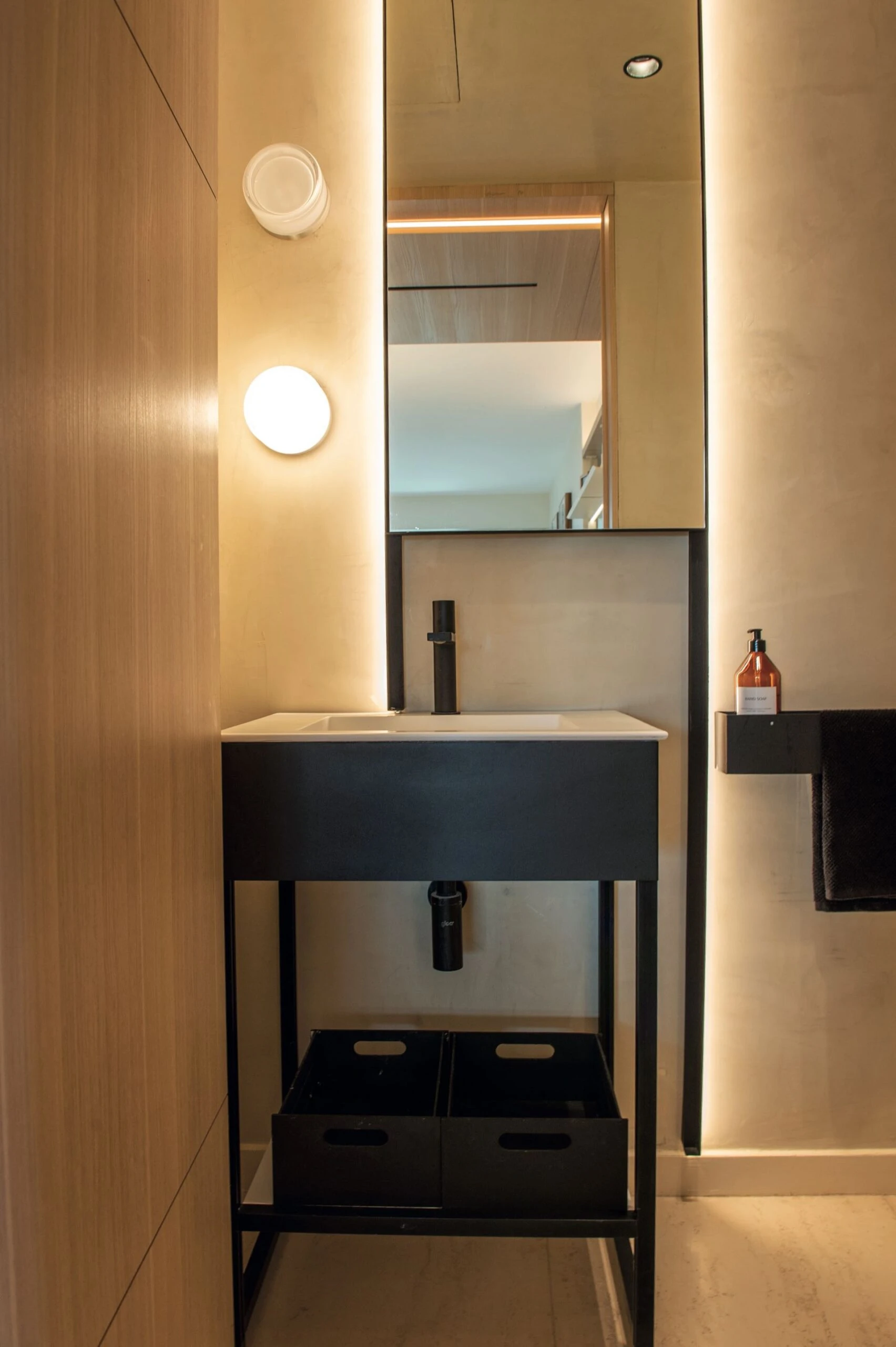 Bonus Track: el pasillo de entrada al departamento se trabajó con paredes en gris y un gran espejo retroiluminado. Desde el techo, otro aplique con cuerpo negro suma una luz puntual sobre el banco de tronco quemado, generando un efecto teatral que da la bienvenida.