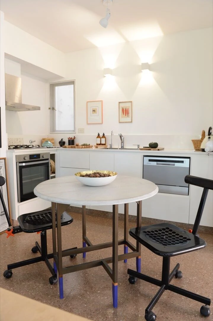 La cocina está integrada y suma a modo de comedor diario una mesa redonda de madera maciza pintada a mano por Laura Ocampo, acompañada de un juego de sillas negras italianas de Herón Parigi, un hallazgo de Laura Ocampo en Buenos Aires exhibidas en su emblemático local, 30Quarenta.