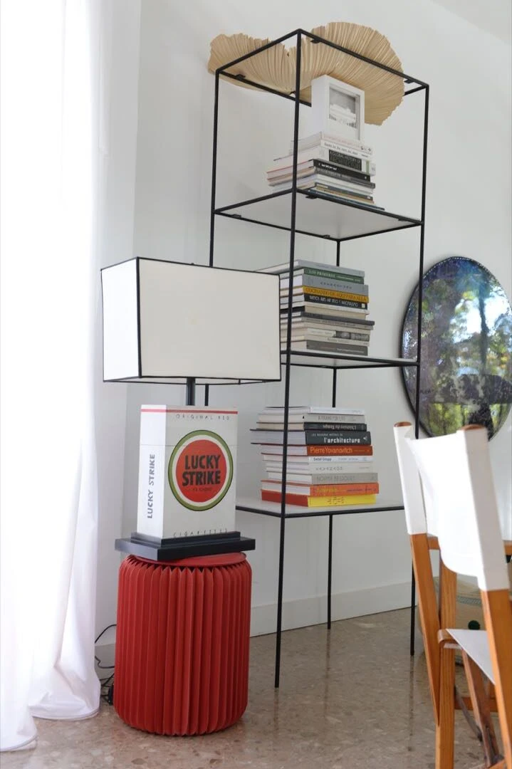 La estantería de hierro (Machimbre) se acomoda junto a una obra de arte circular de Nicolás Bedel. Hacia el otro lado, un banco de cartón pintado en rojo mate le da apoyo a la lámpara de mesa Lucky Strike diseñada por su madre, la decoradora Laura Ocampo, en tanto la lámpara cónica bicolor lleva la firma de Alberto Churba.