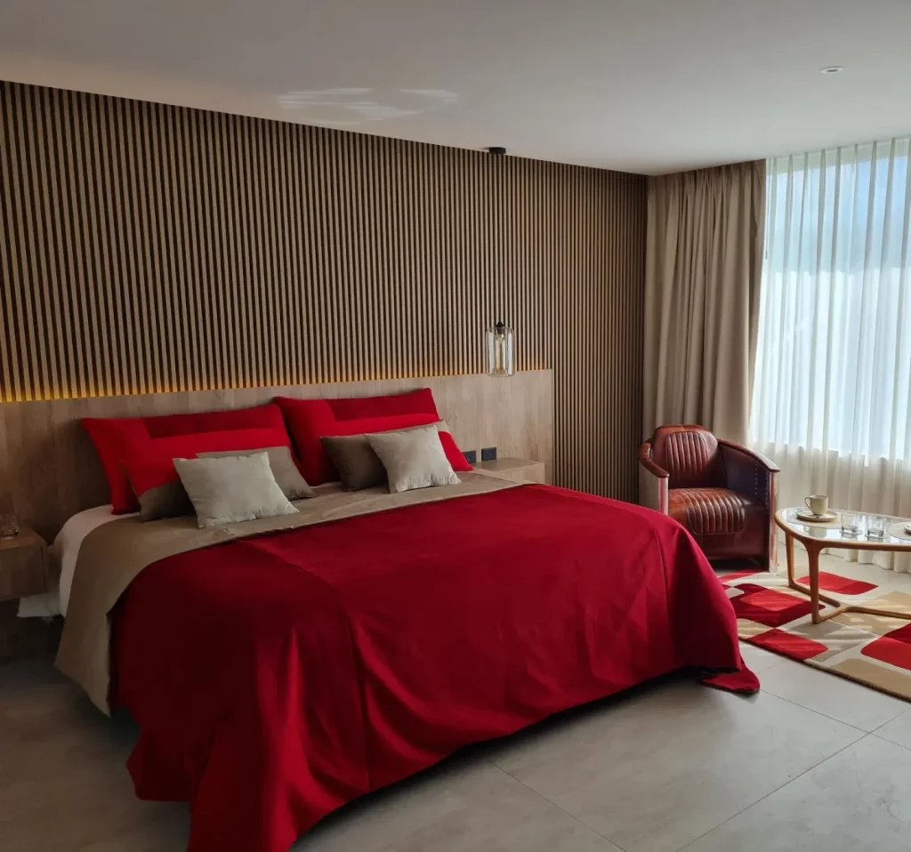 con colores fuertes y materiales nobles. Así fue como fusionamos sillones aviador para crear una suite que es un lounge vip de un aeropuerto con alfombras con personalidad que son cuadros y marcan estilo", agrega.