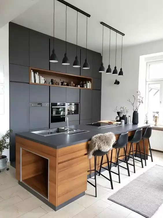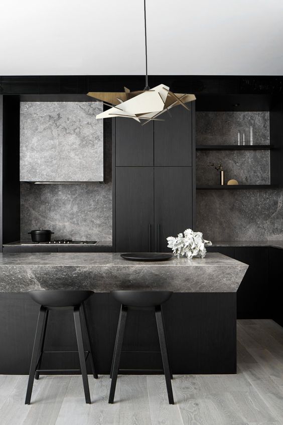 Combinadas con diferentes colores, materiales, texturas o simplemente 100% negras, estas cocinas son ideales para espacios amplios y muy luminosos, ya que en ellas predomina este color que suele achicar visualmente el ambiente y puede resultar agobiante.