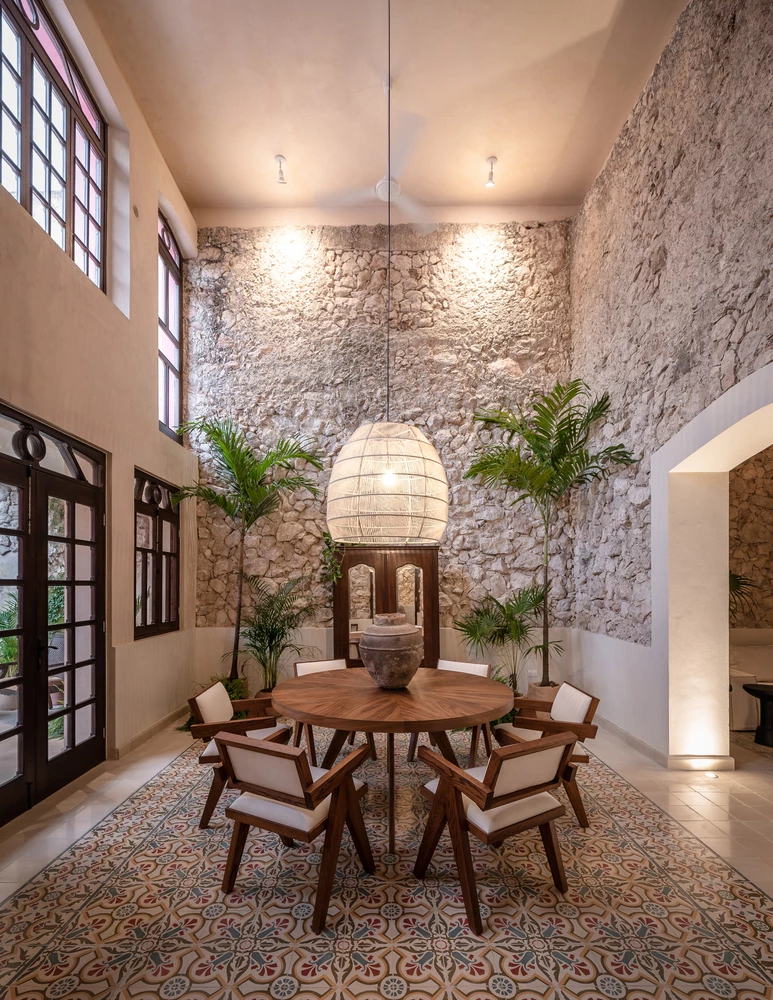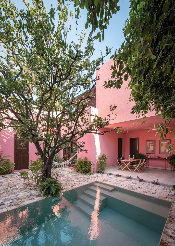 El patio central pretende romper por completo con los colores neutros del interior, con un rosa mexicano intenso, resaltando el color de la carpintería y de la vegetación tropical que rodea al espacio. El piso de piedra enlaza de manera simbólica el interior con el exterior y envuelve a la alberca de chukum, creando el ambiente perfecto para relajarse en el cálido clima yucateco.